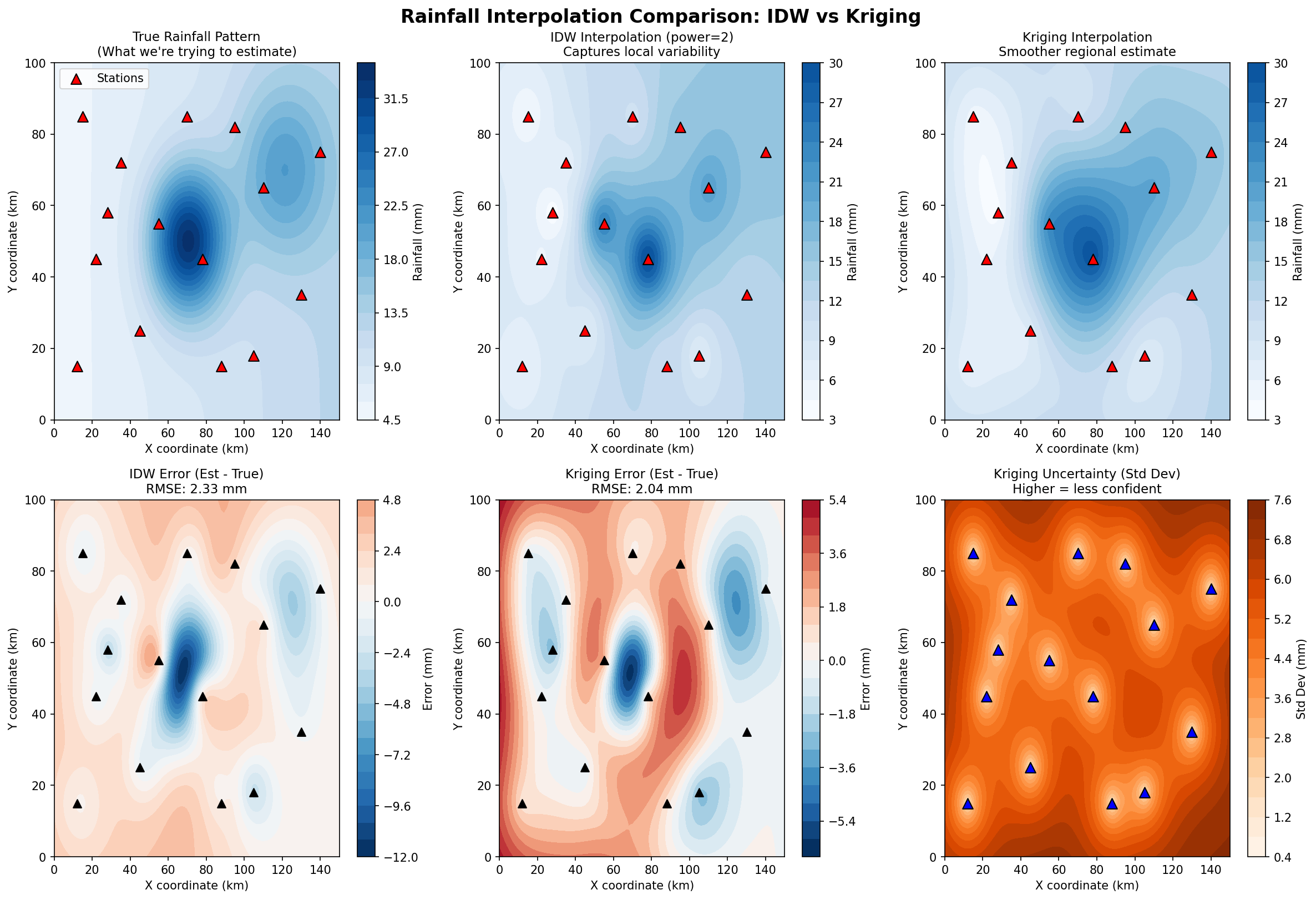 print(f"{'RMSE (mm)':<25} {idw_rmse:<12.2f} {kriging_rmse:<12.2f}")